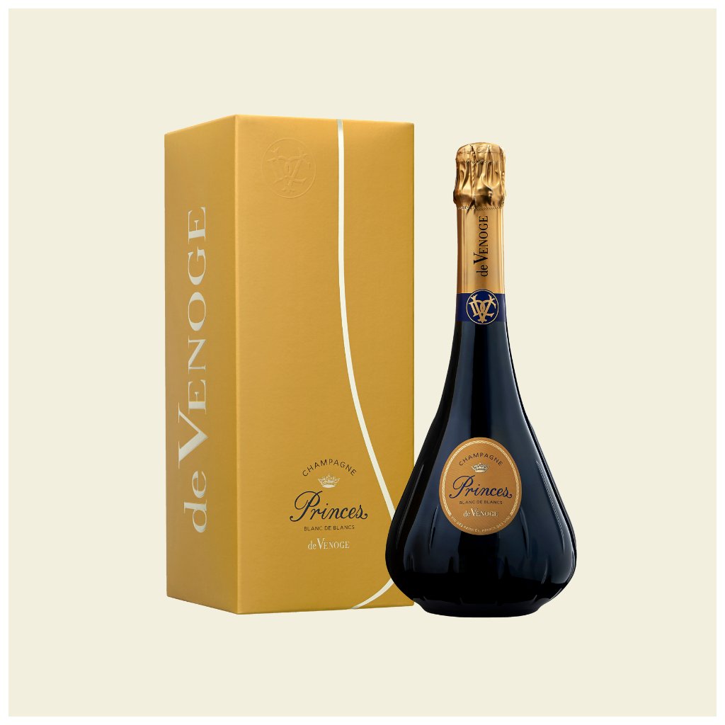 „de Venoge Princes Blanc de Blancs Brut NV (100 % Chardonnay z vinic Grand Cru a Premier Cru včetně Le Mesnil-sur-Oger, Trépail a Vertus; cca 30 % réserve; dozáž ~6 g/l, zrání min. 5 let) — nabízí elegantní, svěží a minerální profil s tóny citrusové kůry, bílých květů, mandlí a jemného pečiva. V chuti je precizní, krémový a živý, s čistým, dlouhým závěrem a výraznou mineralitou typickou pro terroir Côte des Blancs.“